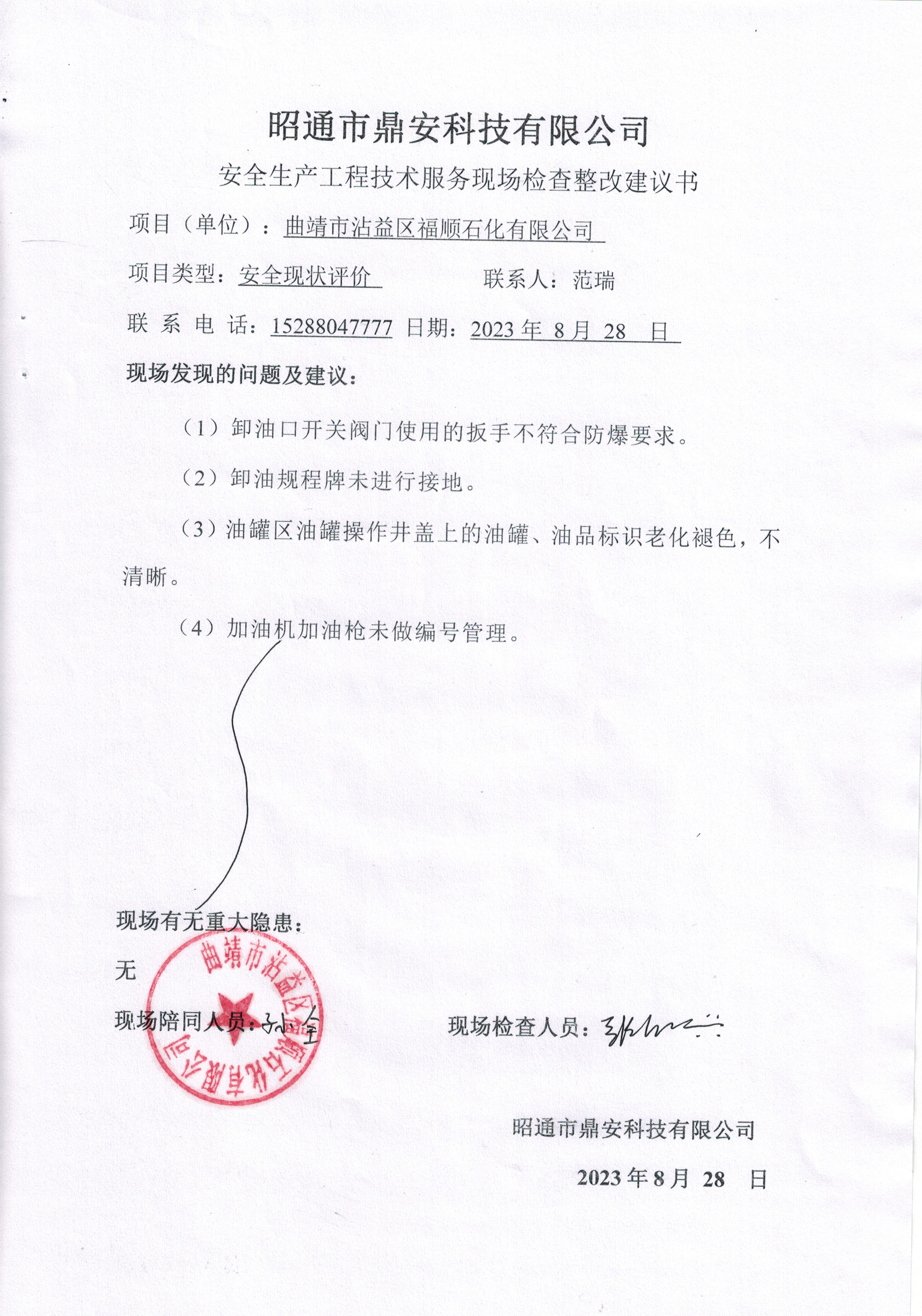 項目名稱 | 曲靖市沾益區福順石化有限公司安全現狀評價報告 | 合同編號 | DAAPQJ2023-34 | |||||