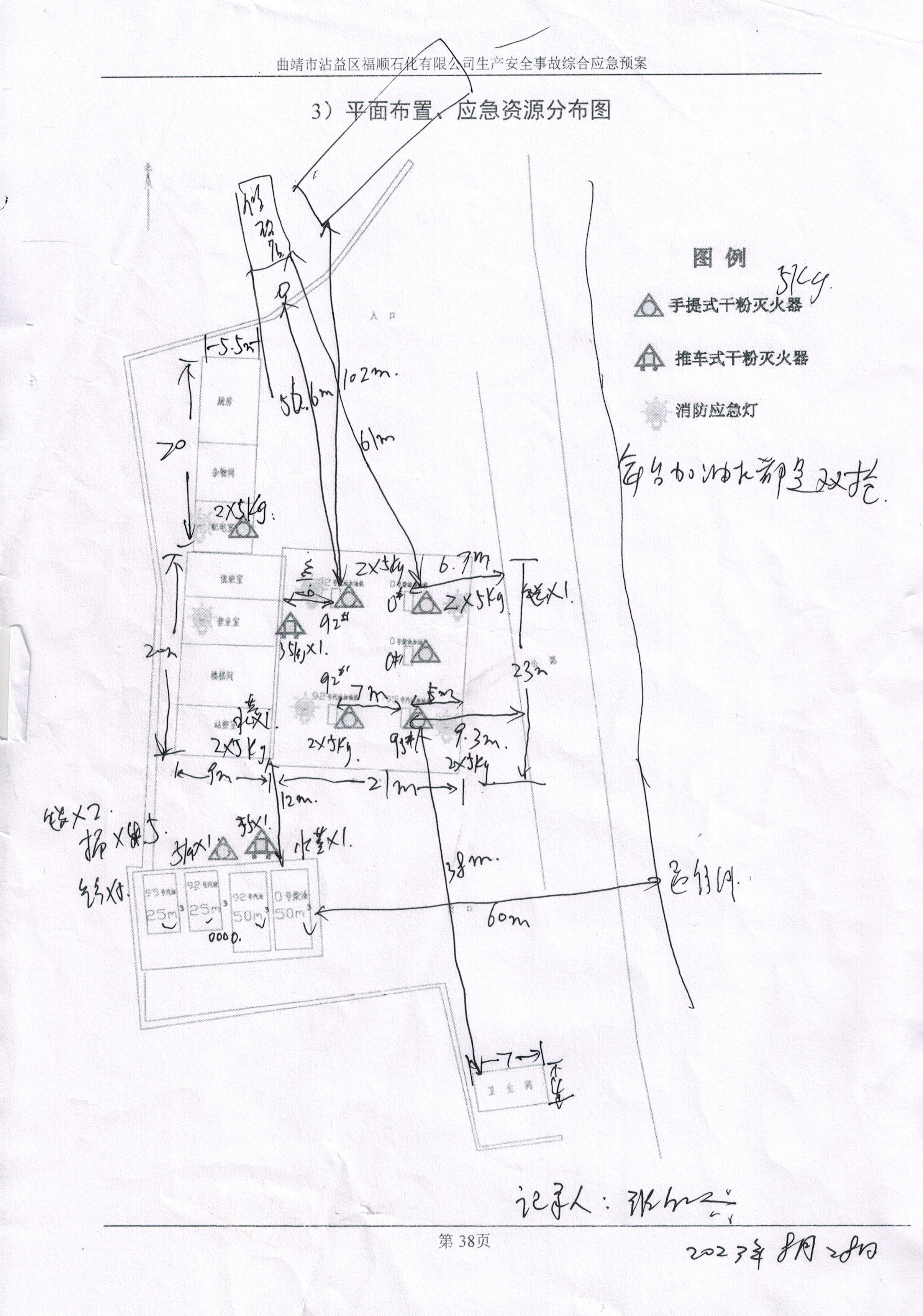 隱患:(1)卸油口開關閥門使用的扳手不符合防爆要求。(2)卸油規程牌未進行接地。(3)油罐區油罐操作井蓋上的油罐、油品標識老化褪色,不清晰。(4)加油機加油槍未做編號管理。(5)配電室內的加油機配電箱、水泵配電箱的箱體未做接地保護。 | ||||||||