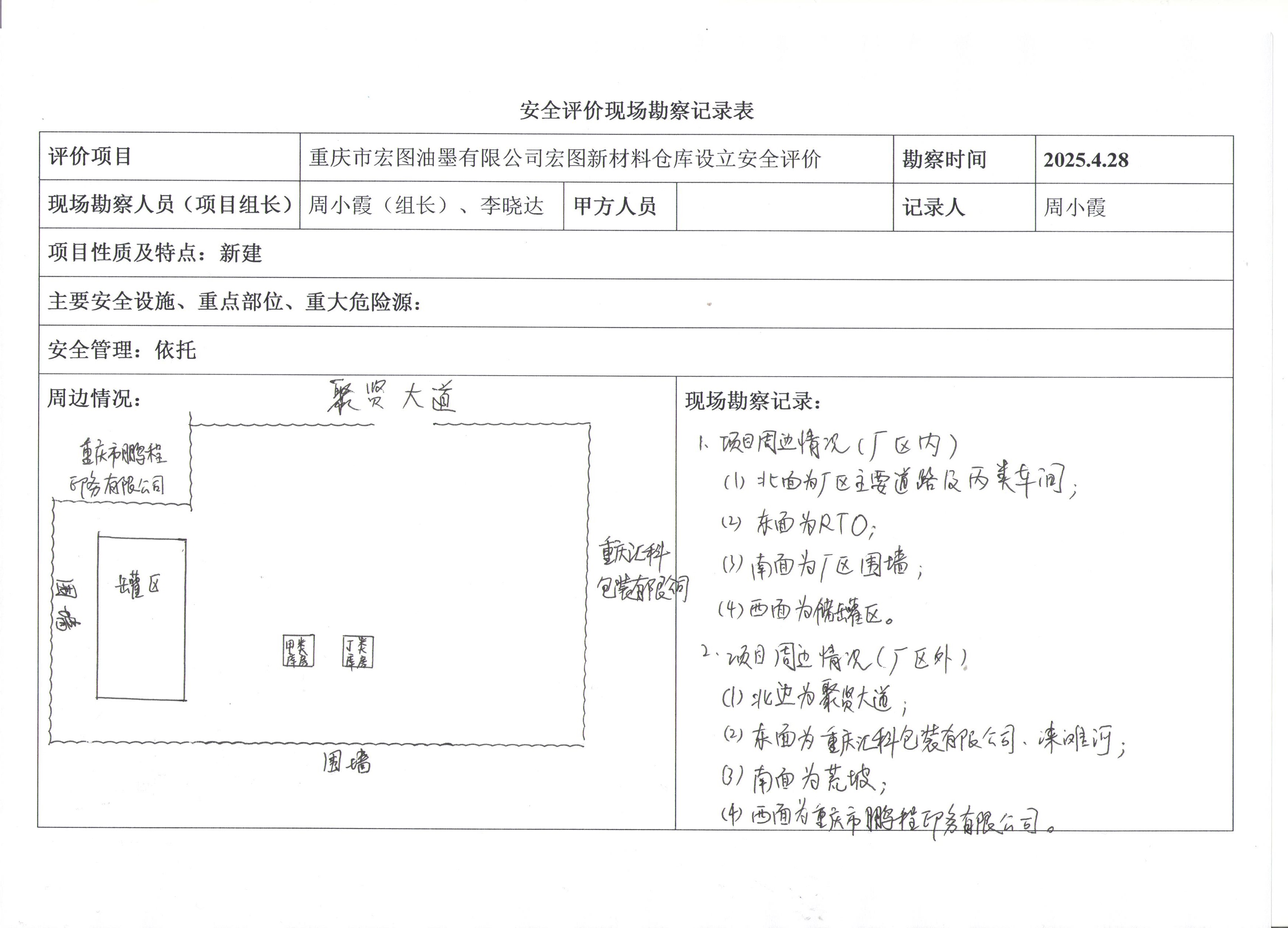 項目名稱 | 重慶市宏圖油墨有限公司宏圖新材料倉庫設立安全評價報告 | 合同編號 | DA(渝)-PJ-202500328 | |||||